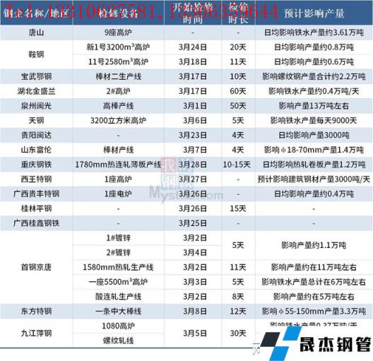 據(jù)不完全統(tǒng)計,截至3月28日超20家無縫厚壁鋼管廠家發(fā)布檢修計劃。其中,檢修時間最長的是湖北金盛蘭,計劃自3月17日對2#高爐進(jìn)行檢修兩個月,預(yù)計影響鐵水產(chǎn)量約0.4萬噸/天,復(fù)產(chǎn)時間5月16日。