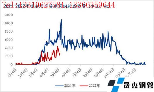 4月哈爾濱市場螺線成交量日均值在2233噸,同比減少3521噸減幅61%,今年成交高值在4330噸,去年成交高值在7900噸。疫情管控下,下游需求啟動緩慢,同時商家對于后期預期較弱扣貨意愿較低,市場成交活躍度大大低于常態。