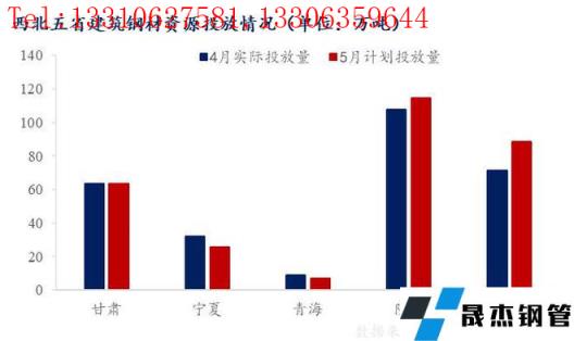5月,西北各省份主要無縫厚壁鋼管廠家預計投放總量299.4萬噸,較4月實際投放量增加16.06萬噸,增幅5.7%。其中寧夏和青海受無縫厚壁鋼管廠家生產減少影響,投放有所減量;甘肅基本達到產銷平衡,而新疆和陜西由于目前無縫厚壁鋼管廠家自有庫存壓力較大,降庫存意圖明顯,資源投放預期有所增加。