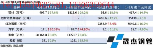 ◎ 海關總署:2022年4月中國出口厚壁無縫鋼管497.7萬噸,較上月增加3.2萬噸,同比下降37.6%;1-4月累計出口厚壁無縫鋼管1815.6萬噸,同比下降29.2%。其他主要品種進出口量情況如下: