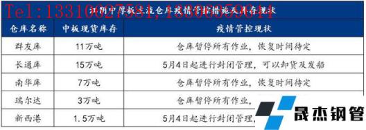 5月4日,江陰疫情爆發,本地中厚板主流倉庫群友庫、南華庫、瑞爾達庫全部暫停所有作業,卸貨、提貨均停止,涉及中板庫存量21萬噸。長通庫、新西港施行封閉管理,碼頭可以卸貨及發船,汽運停止,涉及中板庫存量16.5萬噸。此輪疫情管控,使得江陰本地40萬噸現貨中板庫存將近一半成為死庫存,另外一半流通性也大大減弱,具體明細如下: