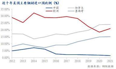 拜登此次提到的取消關稅,針對的是2018年7月后開始的“懲罰性”關稅,與鋼鐵關稅有所區別,除非宣布同時取消,否則只會間接影響國內厚壁無縫鋼管市場。根據美國商務部公布數據顯示,近十年來美國厚壁無縫鋼管進口量在2000萬噸—4000萬噸之間,歐洲、加拿大、墨西哥為美國前三大厚壁無縫鋼管進口國,而來自中國的進口比例并不高。從圖中可以看出,2018年美國加征鋼鐵關稅以后,來自歐洲的進口比例有所下降,加拿大、墨西哥的進口比例有所上升,而中國的進口比例變化不大。即使后期鋼鐵關稅取消,國內對美厚壁無縫鋼管出口影響有限。