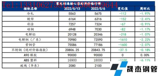 截止2022年5月13日,各原材料當日即時價格以及價格周環比情況如下: