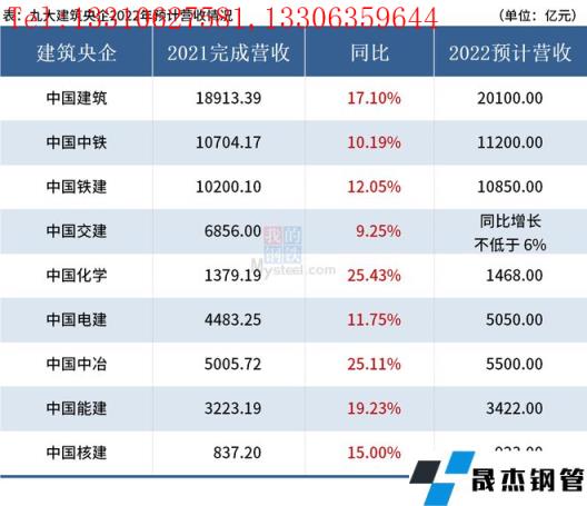 免責聲明:本網站(山東聊城晟杰無縫鋼管廠m.ahcom.com.cn)刊載的“9大建筑央企預計2022年營收超6.6萬億元”等均源于網絡,版權歸原作者所有,且僅代表原作者觀點,本文所載信息僅供參考。轉載僅為學習與交流之目的,如無意中侵犯您的合法權益,請及時聯系刪除。本網站刊登此篇文章并不意味著本站贊同其觀點或證實其內容的真實性,我們不對其科學性、嚴肅性等作任何形式的保證。如果侵犯了您的版權,請盡快聯系我們予以撤銷,謝謝合作!