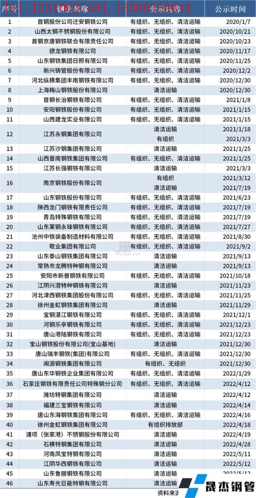 自2020年8月起,中國(guó)鋼鐵工業(yè)協(xié)會(huì)開展了鋼鐵企業(yè)超低排放改造和評(píng)估監(jiān)測(cè)進(jìn)展情況公示工作。截至2022年5月13日,已有46家鋼鐵企業(yè)在鋼協(xié)網(wǎng)站進(jìn)行公示。5月以來新增4家企業(yè),分別為河南鳳寶特鋼有限公司、江陰華西鋼鐵有限公司、山東魯麗鋼鐵有限公司和山東壽光巨能特鋼有限公司。
