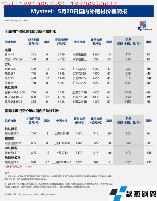 免責聲明:本網站(山東聊城晟杰無縫鋼管廠m.ahcom.com.cn)刊載的“2022年05月20日日報:國內外鋼材_無縫鋼管價差匯總(2022.5.20)”等均源于網絡,版權歸原作者所有,且僅代表原作者觀點,本文所載信息僅供參考。轉載僅為學習與交流之目的,如無意中侵犯您的合法權益,請及時聯系刪除。本網站刊登此篇文章并不意味著本站贊同其觀點或證實其內容的真實性,我們不對其科學性、嚴肅性等作任何形式的保證。如果侵犯了您的版權,請盡快聯系我們予以撤銷,謝謝合作!
