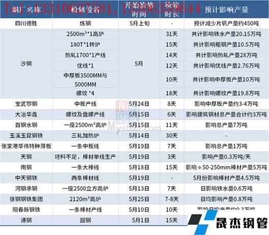 據不完全統計,截至5月25日,國內14家無縫厚壁鋼管廠家發布檢修計劃。其中,徐鋼鋼鐵集團計劃25日對2120m3高爐進行為期7-8天停產檢修計劃,日均影響產量0.8萬噸。