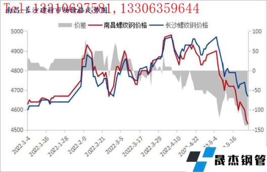 2022年以來,長沙、南昌建材市場價格在全國主要城市價格排名中,先后處于排名末位,在2022年1至3月中旬,長沙建材價格徘徊于全國排名倒數(shù)5位,此間南昌螺紋鋼基價高于長沙30-40元/噸左右,南昌螺紋鋼價格排名常處于倒數(shù)6-10位區(qū)間,略高于長沙。從三月中旬開始,南昌螺紋鋼基價已低于長沙,到四月低,長沙、南昌兩個難兄難弟全國排名雙雙長時間盤踞于全國排名倒數(shù)五位。進入5月后,南昌與長沙兩地價差越拉越大,南昌螺紋鋼基價全國排名穩(wěn)穩(wěn)占據(jù)著倒數(shù)第一的位置,此時長沙建材價格排名越來越高,已有較長時間處于全國中游水平,截止目前長沙與南昌的基差已拉大到140元/噸左右,具體價差變化情況如下圖所示。