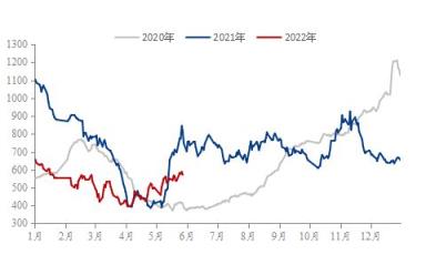 首先,供給端方面,據調研顯示,截至2022年5月27日,37家熱軋板卷生產企業中,無縫厚壁鋼管廠家產能利用率為80.87%,能夠從圖2可以觀察到2022年1-5月份,熱軋產能利用率是低于2021年同期水平,因此無縫厚壁鋼管廠家熱軋產量給到市場的供給壓力是在持續減弱,對于熱軋價格起到了一定的支撐作用。再來看下無縫厚壁鋼管廠家的冷軋產能利用率, 2020年與2021年冷軋產能利用率均值分別為77.96%與81.05%。截至2022年5月27日,29家冷軋板卷生產企業中,冷軋產能利用率為83.04%,從年同比數據對比之下,能夠反映出冷軋產能利用率已經達到相對飽和狀態。
