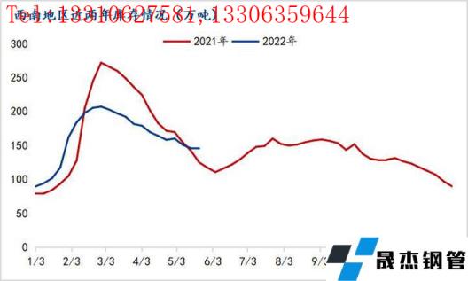 截至5月31日,西南地區建筑厚壁無縫鋼管社會庫存總量146.57萬噸,持續下降,較4月份減少11.58萬噸,降幅達7.32%,較去年同期增加21.63萬噸,增幅達17.31%,去庫速度有所放緩,庫存體量高于去年同期。主要原因是:1、西南地區與周邊區域價差逐步修復,云貴區域無縫厚壁鋼管廠家減少對廣西、廣東、湖南等區域外資源投放;2、資金依舊是制約需求的主要因素,終端開工率未見明顯好轉;3、西南區域逐步進入雨季,下游施工受限,市場成交受阻;4、川渝區域無縫厚壁鋼管廠家得益于電費、原料等優勢,并未虧損,減產力度有限。五月份以來,西南區域供需雙弱,供需矛盾加大,市場去庫難度加大,庫存體量高于去年。