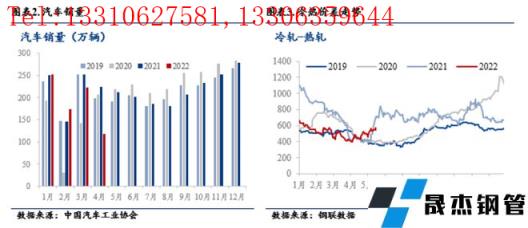 汽車行業作為我國厚壁無縫鋼管消費重要的下游行業,其厚壁無縫鋼管用量約占汽車總重量的70%左右。整車制造過程中,轎車單車厚壁無縫鋼管耗量1噸左右,其中,冷軋是汽車厚壁無縫鋼管消費“主力”,約占汽車厚壁無縫鋼管消費的30%,未來汽車需求增量將直接影響冷軋價格走勢。一般而言,汽車產銷旺季在下半年開啟,尤其在第四季度達到頂峰,隨著汽車消費回升,冷熱價差呈現規律性擴大。2022年以來,受疫情影響,汽車生產和消費受到抑制,尤其是4月份,國內汽車銷量同比、環比降幅均超過40%。本次汽車購置稅減半政策力度大,涉及范圍廣,對刺激市場消費、提振消費者信心起到重要作用,預計下半年汽車產銷將得到有力回補,7-8月汽車產銷或呈現“淡季不淡”的特征,冷軋價格將得到提振,預計下半年冷熱價差或長期居于高位。
