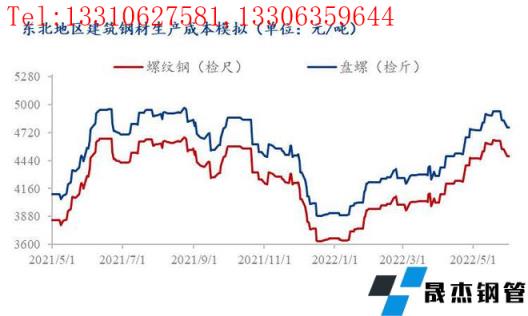 受無縫厚壁鋼管廠家利潤擠壓至負影響,4、5月份原材料價格被迫下調,焦炭4輪提降降800元/噸,但從無縫厚壁鋼管廠家層面了解到,降價后焦化廠新接訂單量少、實際落地效果有限。從東北地區建筑厚壁無縫鋼管生產成本模型(最低成本模式)來看,截至2022年5月末,東北地區螺紋鋼模擬生產成本4480元/噸左右、較4月末增加15元/噸、較去年5月末增加190元/噸,盤螺模擬生產成本4770元/噸左右、較4月末增加20元/噸左右、較去年5月末增加200元/噸;從月均成本來看,2022年5月螺紋模擬生產成本4570元/噸、較4月增加310元/噸、較去年5月增加560元/噸,盤螺模擬生產成本4860元/噸、較4月增加320元/噸、較去年5月增加580元/噸。