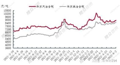 從華東江里汽柴油船單價格來看:6月初汽油均值為8925元/噸,環比上月8713元/噸的均值,上漲213元/噸,漲幅2.44%。而柴油6月初均值為8525元/噸,環比上月8339元/噸的均值,上漲186元/噸,漲幅2.23%。見上圖1。