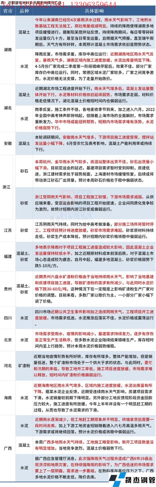 截至6月6日,據(jù)百年建筑網(wǎng)調(diào)研,華中、華東、西南、華南等12省市建材市場和建筑工地進(jìn)度受到明顯影響。短期來看隨著部分省份農(nóng)忙和大規(guī)模雨水天氣預(yù)報(bào)來臨,部分材料整體增量仍然有限,下游市場需求受到一定抑制,市場進(jìn)入需求淡季,端午節(jié)前后價格隨之出現(xiàn)下跌情況。具體情況如下: