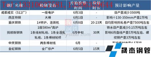 據(jù)不完全統(tǒng)計,截至6月7日,國內(nèi)6家無縫厚壁鋼管廠家發(fā)布檢修計劃。其中,撫順新鋼鐵計劃6月中旬起對廠內(nèi)1座580m3高爐進行30天左右的年修,預(yù)計鐵水日產(chǎn)量減少0.15萬噸左右、共影響鐵水產(chǎn)量4.5萬噸左右;同時1條線材軋線、1條全連軋軋線、1條棒材輪修,預(yù)計影響6月盤線產(chǎn)量5萬噸左右、螺紋鋼產(chǎn)量3萬噸左右。