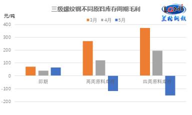 5月份由于成本表現(xiàn)分化,市場(chǎng)均值震蕩下行,使得5月份品種噸鋼毛利相比上月有明顯差異。以三級(jí)螺紋鋼為例,以即期原料成本測(cè)算5月份毛利空間較上月上升25元/噸,以?xún)芍堋⑺闹茉蠋?kù)存周期測(cè)算5月份毛利空間均進(jìn)入虧損負(fù)值區(qū)間,兩周原料庫(kù)存周期測(cè)算毛利較上月減少239元/噸,以四周原料庫(kù)存周期測(cè)算5月份毛利空間較上月減少347元/噸(詳見(jiàn)圖2)。