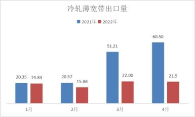 冷軋品種出口方面,4月份出口量同比下降,尤其以冷軋薄寬帶下降幅度最大,具體數(shù)據(jù)來(lái)看,冷軋薄板出口量為21.55萬(wàn)噸,同比下降3.23%;冷軋薄寬帶出口量為21.5萬(wàn)噸,同比下降64.46%,冷軋窄鋼帶出口量為3.79萬(wàn)噸,同比下降1.81%。