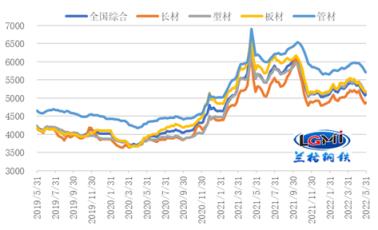 5月份,穩(wěn)增長信號和政策雖明顯加強,但受疫情影響下游需求釋放緩慢,市場預期和信心明顯不足,國內(nèi)無縫鋼管市場價格持續(xù)震蕩下行。據(jù)云商平臺監(jiān)測數(shù)據(jù)顯示,截至5月31日,全國無縫鋼管 厚壁鋼管綜合價格為5098元,較上月末下跌258元,跌幅為4.8%,年同比下跌10.6%。其中,長材價格為4875元,較上月末下跌288元,跌幅5.6%,年同比下跌8.9%;板材價格為5190元,較上月末下跌235元,跌幅為4.3%,年同比下跌12.8%;型材價格指數(shù)為5166元,較上月末下跌241元,跌幅為4.5%,年同比下跌9.6%;管材價格為5716元,較上月末下跌241元,跌幅為4.1%,年同比下跌8.2%(詳見圖1)。