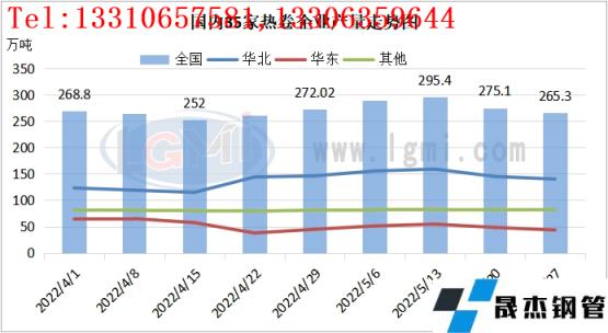 截止2022年5月27日,據(jù)云商平臺(tái)監(jiān)測(cè)數(shù)據(jù)顯示,國(guó)內(nèi)熱軋卷板社會(huì)庫(kù)存量約為243.71萬(wàn)噸,環(huán)比增加10.72萬(wàn)噸。重點(diǎn)城市庫(kù)存整體表現(xiàn)不一,華東、華南庫(kù)存小幅去庫(kù),華北區(qū)域天津社會(huì)庫(kù)存有所累庫(kù)。具體來(lái)看,廣州地區(qū)熱卷社會(huì)庫(kù)存量約為61.91萬(wàn)噸,環(huán)比減少3.05萬(wàn)噸;上海熱卷社會(huì)庫(kù)存量環(huán)比減少0.21萬(wàn)噸至41.84萬(wàn)噸;天津熱卷社會(huì)庫(kù)存量約為7.20萬(wàn)噸,環(huán)比增加1.58萬(wàn)噸。