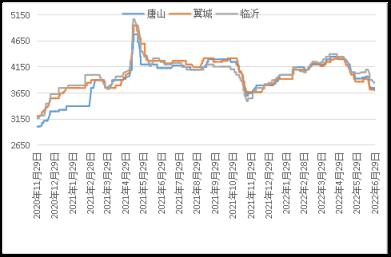 據(jù)云商平臺監(jiān)測數(shù)據(jù)顯示,截至6月30日,煉鋼生鐵天津地區(qū)報價3670元(噸價,下同),較月初跌240元;唐山地區(qū)報價3700元,較月初跌230元;翼城地區(qū)報價3720元,較月初跌150元;臨沂地區(qū)報價3850元,較月初跌180元(詳見圖2)。