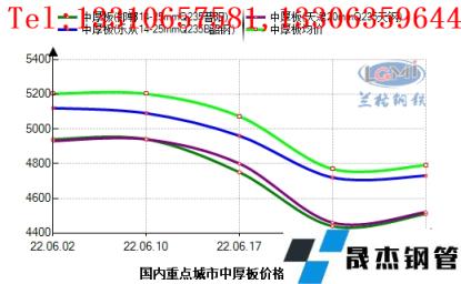6月份上旬國內(nèi)宏觀市場(chǎng)消息面多空博弈,下游商家觀望情緒加重,國內(nèi)中厚板市場(chǎng)需求受到壓制,市場(chǎng)報(bào)價(jià)小幅趨弱。而后因美聯(lián)儲(chǔ)激進(jìn)加息政策出臺(tái),全球金融市場(chǎng)受到?jīng)_擊加劇,使得目前本已處于經(jīng)濟(jì)下行期的全球經(jīng)濟(jì)再次承壓,對(duì)于國內(nèi)市場(chǎng)直接反饋至期貨市場(chǎng),在美聯(lián)儲(chǔ)加息消息發(fā)酵后,期現(xiàn)市場(chǎng)短期內(nèi)呈現(xiàn)斷崖式下跌,在不足一周的交易日內(nèi),國內(nèi)中厚板均價(jià)下調(diào)幅度在240元左右,相較于其他厚壁鋼管品種,中厚板市場(chǎng)抗跌性仍處于強(qiáng)勢(shì)一方。