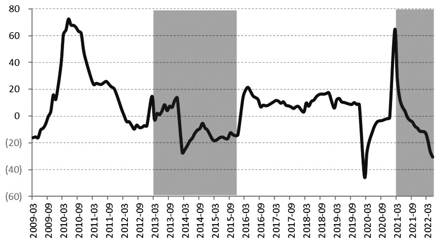 本輪地產(chǎn)調(diào)整周期始于2021年第二季度。在地產(chǎn)相關(guān)政策的驅(qū)動下,從2021年第四季度開始,地產(chǎn)新開工面積再次進入負(fù)增長狀態(tài),疊加疫情影響,降幅呈現(xiàn)加速下滑態(tài)勢。受此影響,螺紋鋼需求降幅可見一斑。根據(jù)上述分析,我們可以清晰看到,當(dāng)前螺紋鋼的需求表現(xiàn)和2013年有很大相似之處。