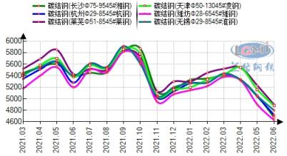據(jù)云商平臺(tái)監(jiān)測(cè)數(shù)據(jù)顯示,截至6月30日,全國(guó)十大主導(dǎo)城市碳結(jié)鋼(45#)平均價(jià)格4848元,較年初跌398元。合結(jié)鋼(40Cr)平均價(jià)格5097元,較年初跌363元。