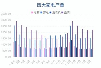 1-6月份,冰箱產(chǎn)量4164.2萬臺,同比下降6.2%;彩電產(chǎn)量8986.4萬臺,同比增長5.8%;洗衣機產(chǎn)量4113.3萬臺,同比下降4.1%;空調(diào)產(chǎn)量12248.9萬臺,同比增長1.1%。