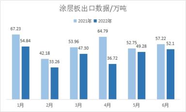2022年6月我國鍍層板(帶)出口總量共計124.86萬噸,月環(huán)比降幅5.82%,年同比降幅20.33%;2022年上半年我國鍍層板(帶)出口總量共計657.43萬噸,年同比降幅15.98%。