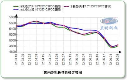 目前由于世界經(jīng)濟(jì)滯脹風(fēng)險(xiǎn)上升,全球加息大潮洶涌澎湃,外部不確定因素明顯增加,需求收縮與供給沖擊交織,結(jié)構(gòu)性矛盾和周期性問題疊加,國內(nèi)經(jīng)濟(jì)持續(xù)恢復(fù)基礎(chǔ)不穩(wěn)固。7月份國內(nèi)正處于傳統(tǒng)季節(jié)性需求淡季,北方面臨高溫天氣,南方面臨雨季影響,對(duì)戶外施工項(xiàng)目產(chǎn)生明顯影響,導(dǎo)致整體厚壁鋼管需求恢復(fù)緩慢。后美聯(lián)儲(chǔ)宣布加息75個(gè)基點(diǎn),低于市場預(yù)期100個(gè)基點(diǎn),從而帶動(dòng)市場有所反彈,使得冷軋板卷市場呈現(xiàn)先跌后漲行情。