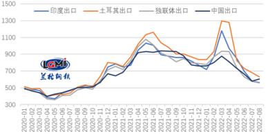 7月份,出口市場競爭激烈,主要出口國繼續(xù)下調厚壁鋼管出口報價。進入8月份,海外需求持續(xù)疲弱,各國厚壁鋼管出口報價仍有所下調,而國內市場出現(xiàn)反彈,出口報價有所上漲,云商平臺監(jiān)測數(shù)據(jù)顯示,2022年8月5日,印度、土耳其、獨聯(lián)體熱軋卷板出口報價(FOB)分別為565美元/噸、630美元/噸和560美元/噸,均較7月底有所下跌,中國熱軋卷板出口報價(FOB)為605美元/噸,較7月底有所上漲。